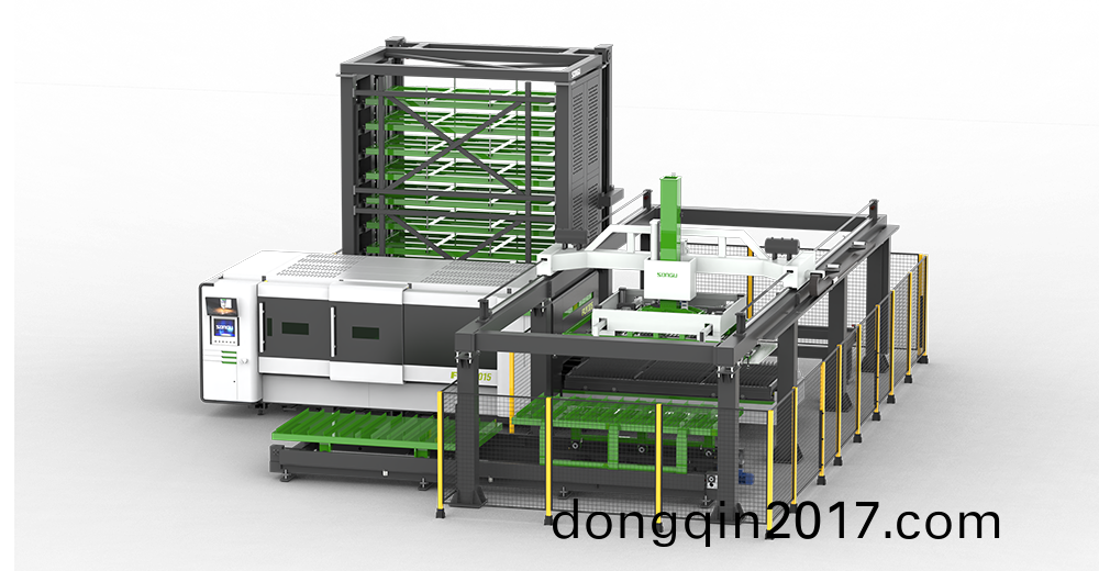 在鬆穀激光切割機的切割平檯上搭(da)載(zai) HyStore 係列自動上下(xia)料及倉儲係統,通過輭件控製係(xi)統進行串聯控製,實現無人值守的全自(zi)動化智能(neng)激光切割生産線;